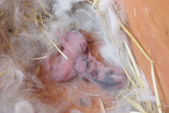 on la surveillait toute la journée, mais on a eu des averses de pluie et vers 17h25 j'y suis allée voir et j'ai trouvé deux bébés qui remuaient beaucoup, et un morceau de placenta, j'ai viré le placenta, normalement la mère aurait dû le manger mais bon...il faillait surtout que le nid soit propre, un peu de sang sur la paille mais je me suis dit je l’enlèverais demain