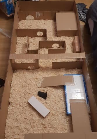 Peut-être que votre animal est un peu stressé car il ne connait pas encore cet environnement, laissez lui un peu de temps. Essayez de lui faire des chemins de nourriture à travers le labyrinthe pour qu'il l'explore et s'y habitue, essayez peut-être aussi de transférer des jouets de sa cage, qu'il connait donc déjà afin qu'il soit rassuré. S'il ne s'arrête pas, essayez peut-être de faire le contour en bois, avec des planches de récupération pour voir s'il a la même attitude.