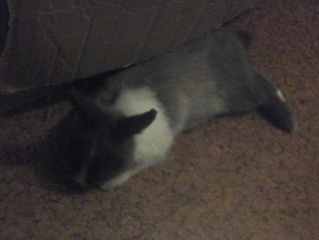 le lapin était en boule dans un trou creusé dans sa litière et ne semblait plus réagir.