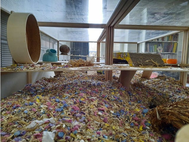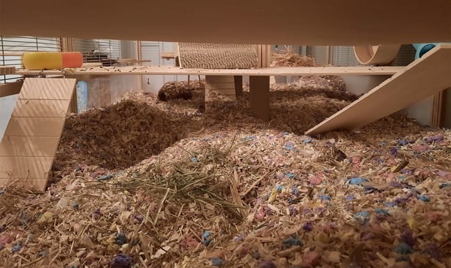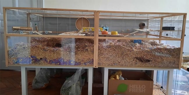Les étages sont mauvais pour les hamsters, ils ne calculent pas les hauteurs et se blessent en se laissant tomber du haut des étages. Le hamster est un animal terrestre donc pas besoin d'étage.