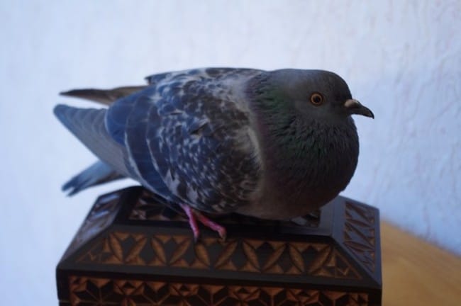 Mon frère revient de chez un copain il remonte en catastrophe pour nous dire qu'un pigeon est en bas qu'il ne bouge pas, Grrrr donc je décent, je le prend avec mes mains il ne bouge pas du tout, ce n'est pas bon signe.