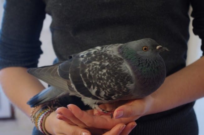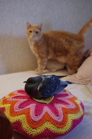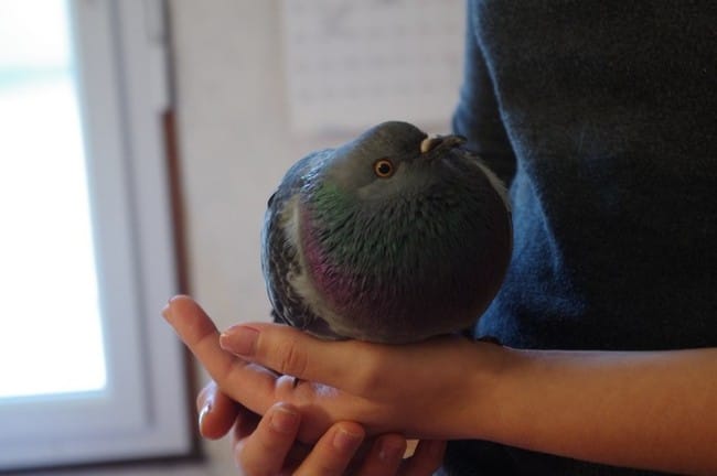 Si tout va bien on le relâchera, ou si on lui trouve quelqu'un ça serait mieux, chez nous impossible de garder un pigeon en sécuriser avec mes chats, surtout que Léo la vu et s'est bien lécher les babines donc on va éviter... on l'a appeler Néo !