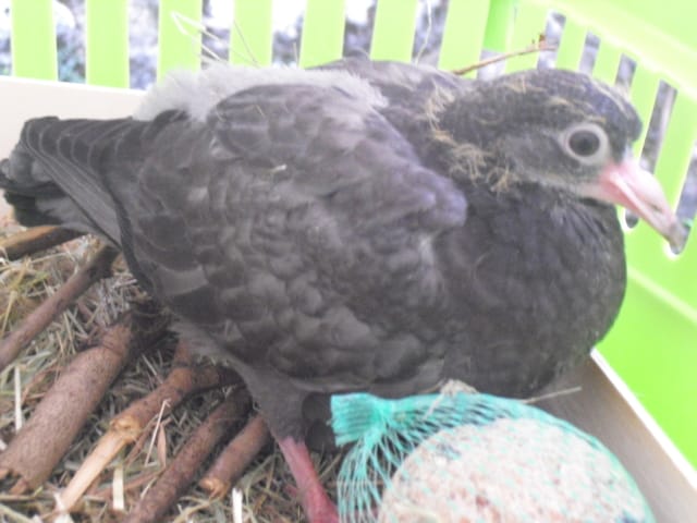 Mon frère revient de chez un copain il remonte en catastrophe pour nous dire qu'un pigeon est en bas qu'il ne bouge pas, Grrrr donc je décent, je le prend avec mes mains il ne bouge pas du tout, ce n'est pas bon signe.