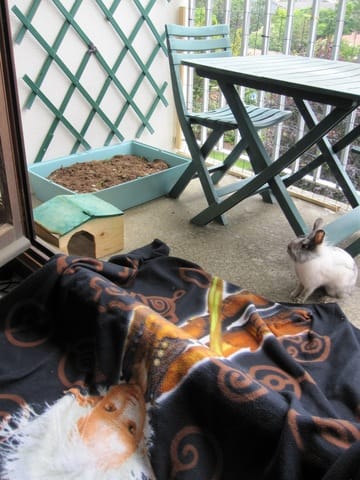 moi elle a une cage dans ma maison mais sauf quand il pleut, je la mets dehors dans un enclos, elle a une maison en bois mais elle préfère une maison en carton, alors j'en ai refait une autre cette après midi et à sa vivacité à rentrer dedans en sortir et venir chercher une caresse j'ai compris qu'elle était contente, je lui mets une couverture de poupée dedans mais elle était mouillée alors elle sèche....