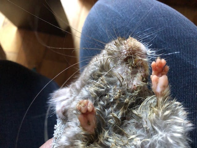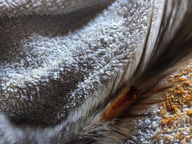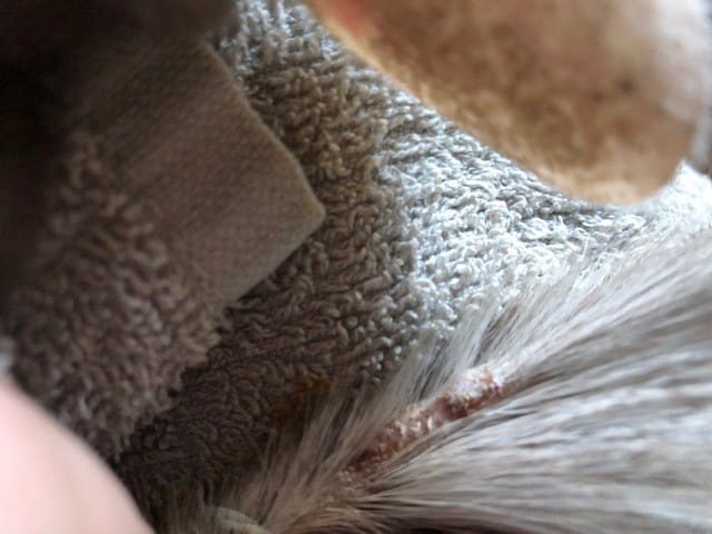 J'ai fait une inspection plus détaillée ce matin et j'ai taché de démêler ses poil sous sa bouche et il est bizarre le pauvre les poils font des paquets et j'ai l'impression qu'il en a perdu autour de son museau et il y a de petites croutes qui se sont formées sur une autre parti de la queue.