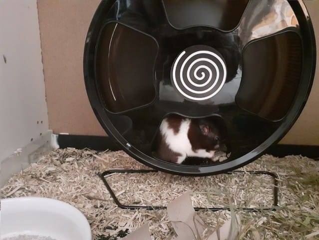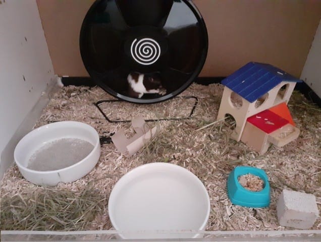Actuellement je mets de la litière de chanvre avec du foin bio, il a une maison à étage, une roue (que je vais bientôt changer donc si vous avez des références je suis preneuse), une baignoire à sable de bain, un biberon et une gamelle. Il mange des carrés HamiForm pour gerbille & hamster avec un mélange de graines et des fruits/légumes frais une fois de temps en temps.