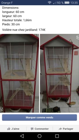 Bonjour, suite au décès de mon chinchilla je met en vente sa volière. La volière est entièrement aménagée, tout a été fait par mon père et c'est très solide. Je la vends avec du sable, de la nourriture et il doit me rester du chanvre. La volière est sur roulettes, le tiroir s'enlève pour mieux nettoyer et elle est de couleur fushia donc plutôt esthétique. Je vend le tout pour 100 €, le prix est ferme.